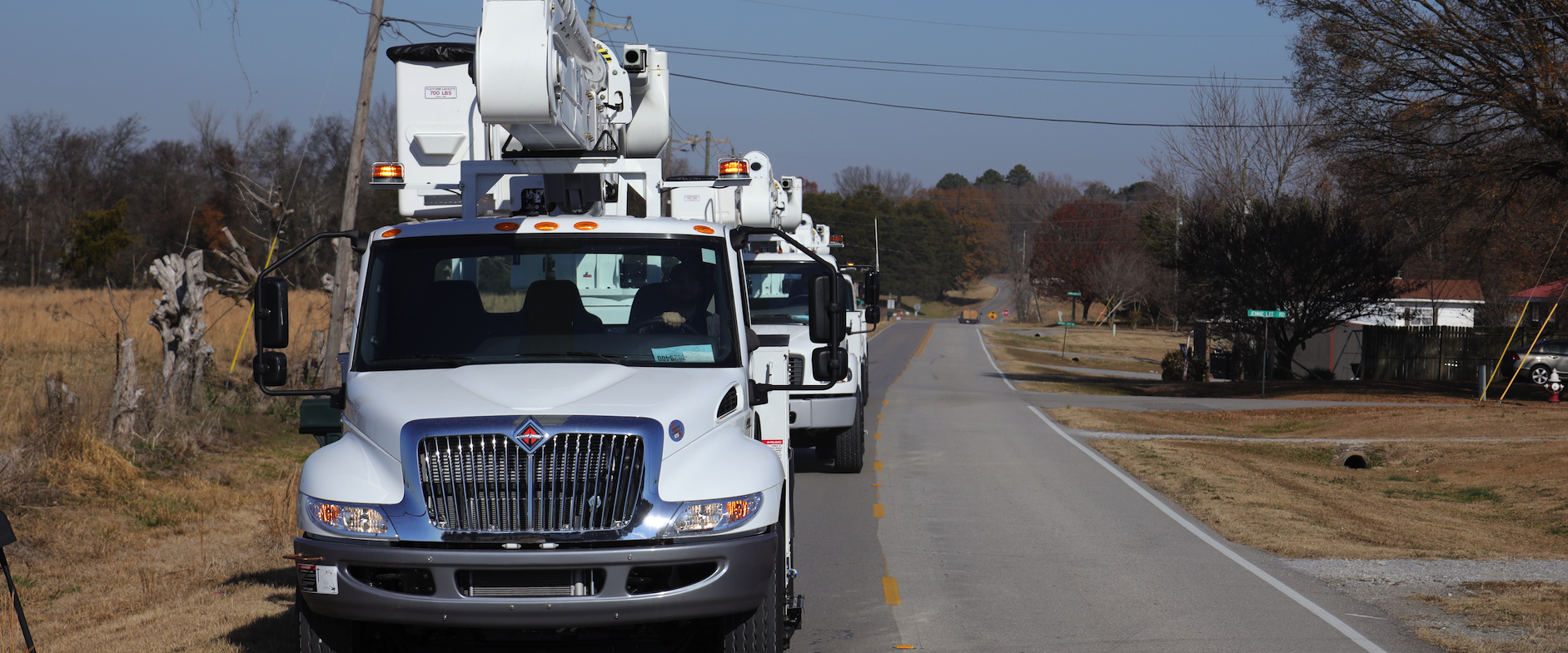 Each Freightliner in our fleet is purpose-built to support the real-world demands of utility infrastructure work. Outfitted with onboard cranes, bucket lifts, tool storage, and crew seating, these trucks serve as mobile command centers in the field. Designed for rugged terrain and extended use, they help our crews stay productive and safe in all working conditions — from flooded storm zones to backwoods transmission corridors.